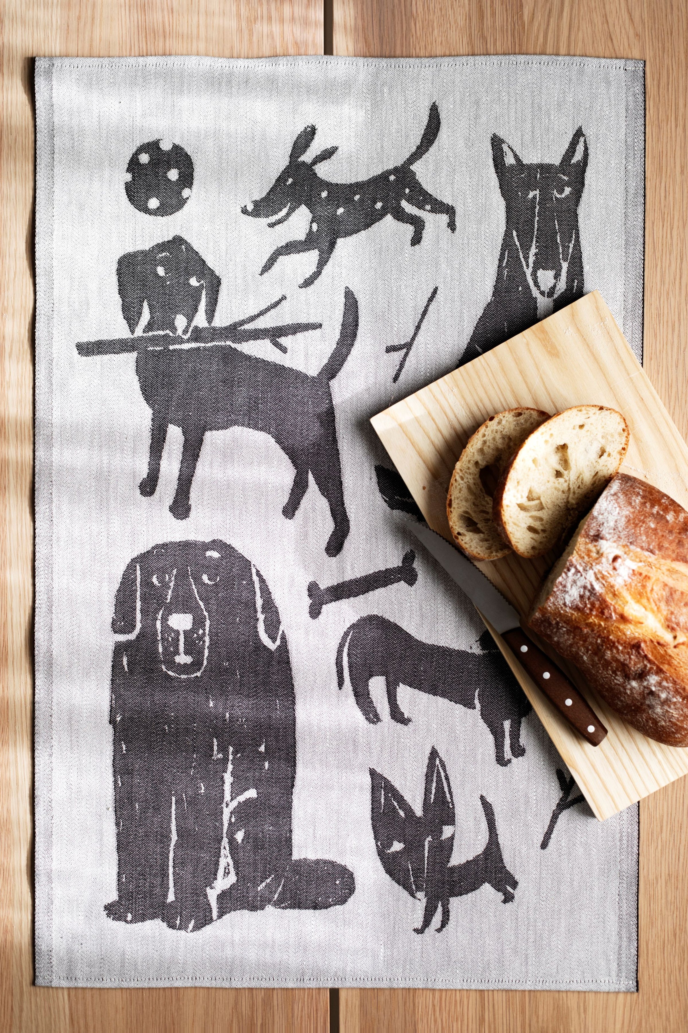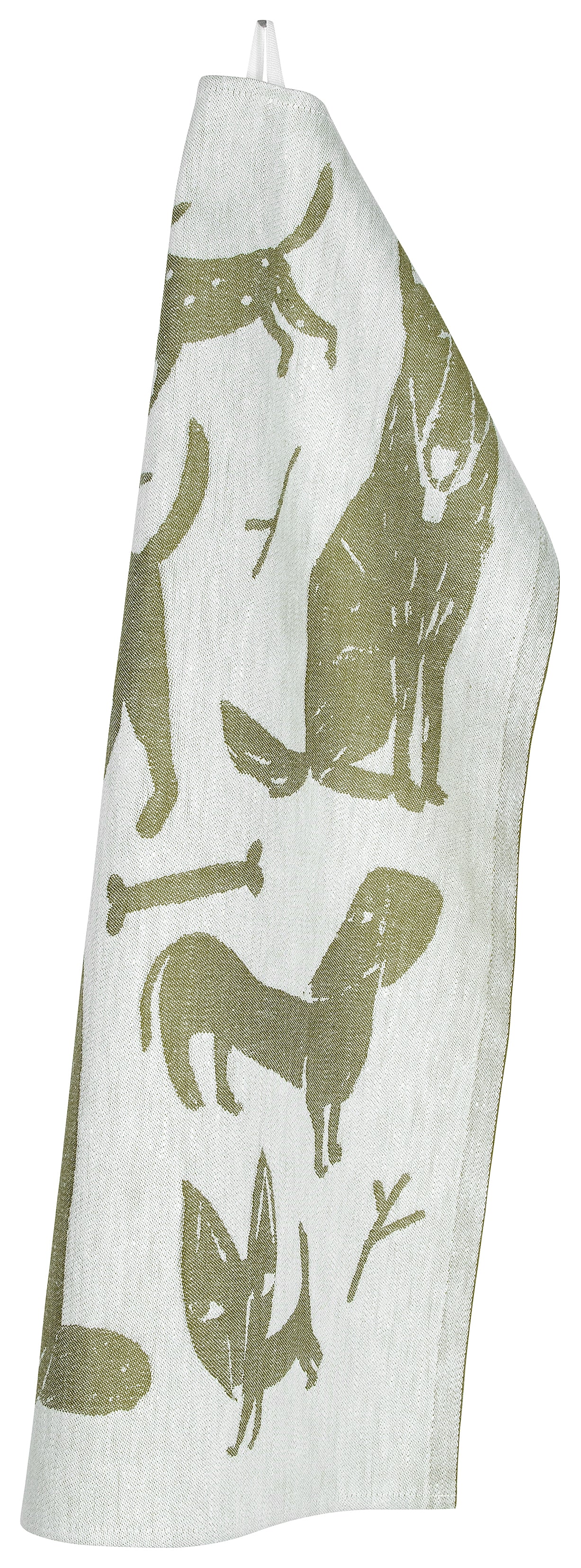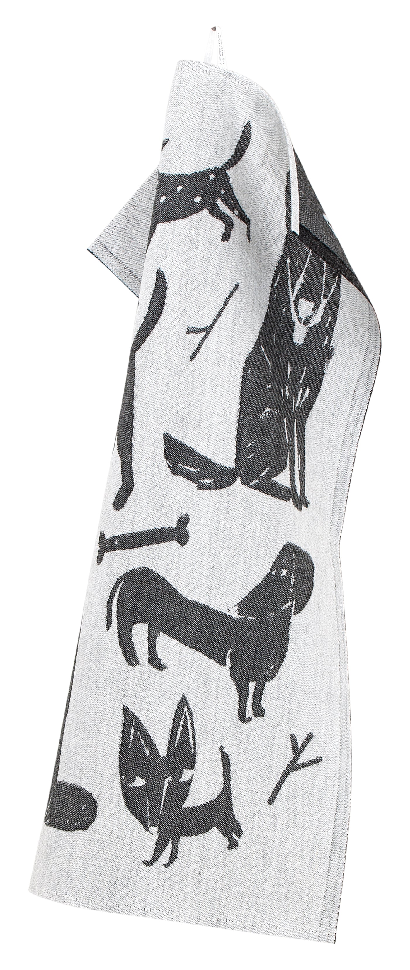 The Koirapuisto tea towel by Lapuan Kankurit features a lively gathering of dogs illustrated by Finnish artist Matti Pikkujämsä — koirapuisto meaning “dog park” in Finnish. The playful motif stands out in a clean black-and-white palette that lends the towel a distinctly graphic charm. The design is fully reversible, appearing in opposite colours on the reverse side.
