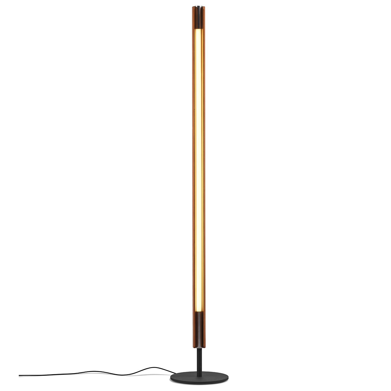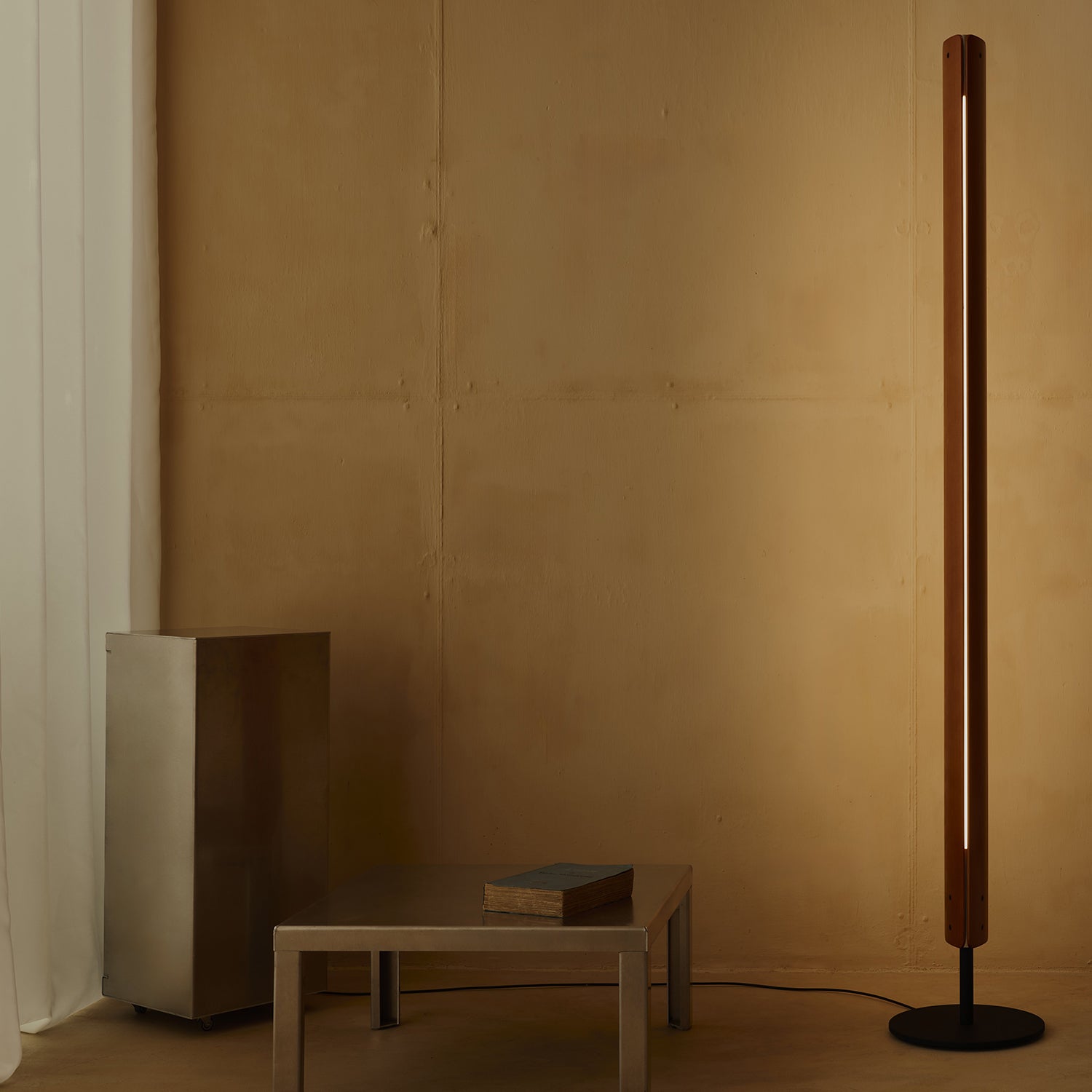 Emitting both direct and indirect light with a symmetrical and asymmetrical distribution, the central tubular light source can be adjusted to suit the needs of the moment with its integrated dimmer function. A circular black aluminium base supports this slimline floor lamp, freeing up space in its surroundings with a minimal footprint.