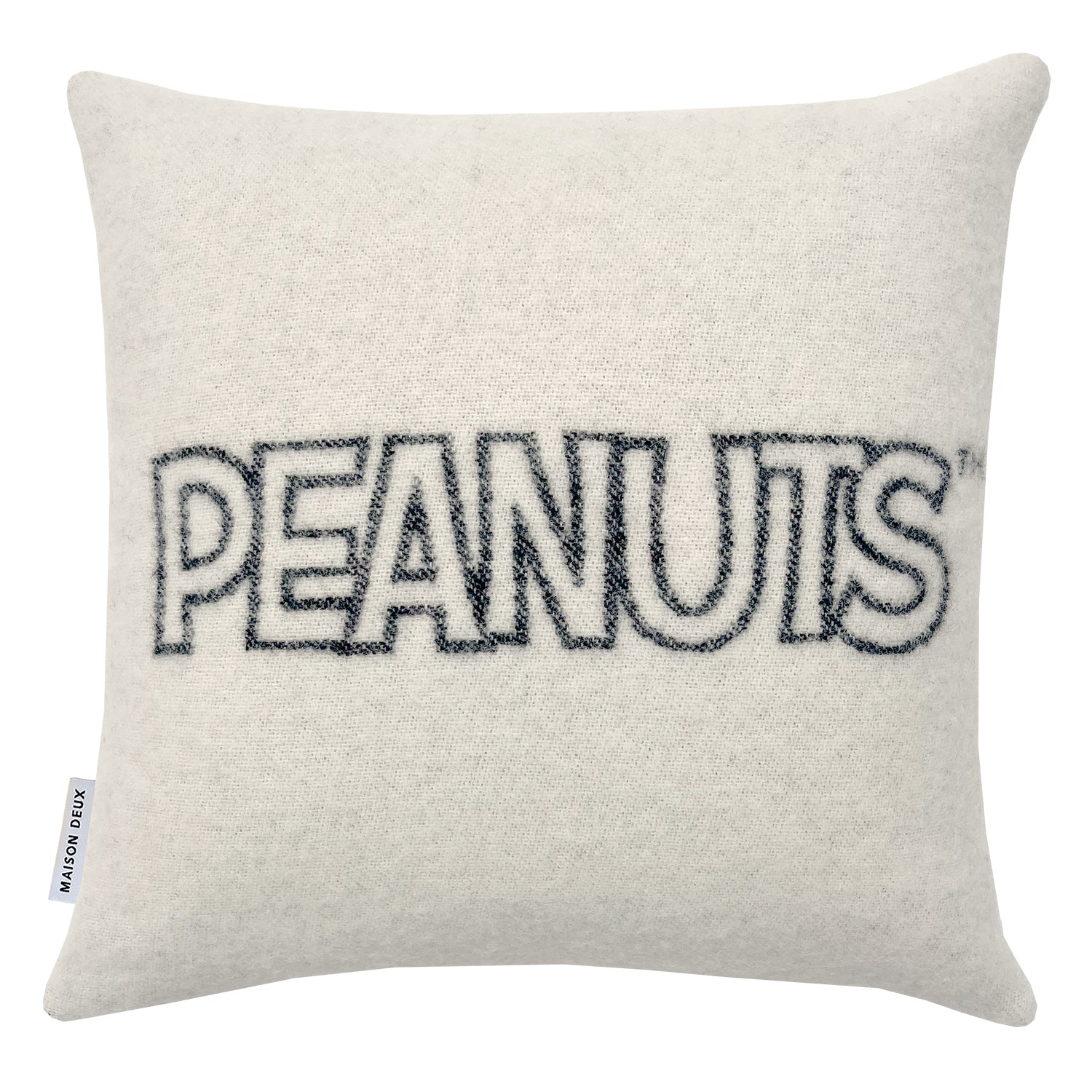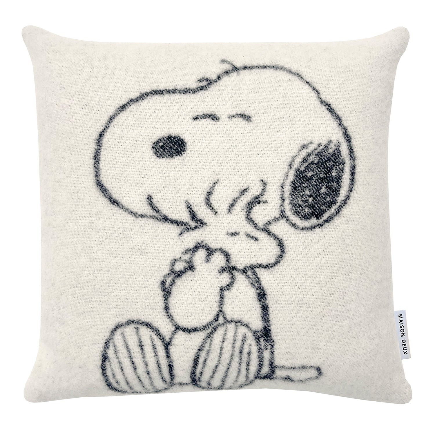 Bringing the iconic characters from Charles M. Schulz story book to life, the Peanuts Cushion by Maison Deux is sure to level up your sofa game. This jacquard-woven cushion cover is made from 100% New Zealand wool and features Snoopy and Woodstock hugging each other. The back of the cushion cover displays the 'Peanuts' logo. Feather cushion filler included.
