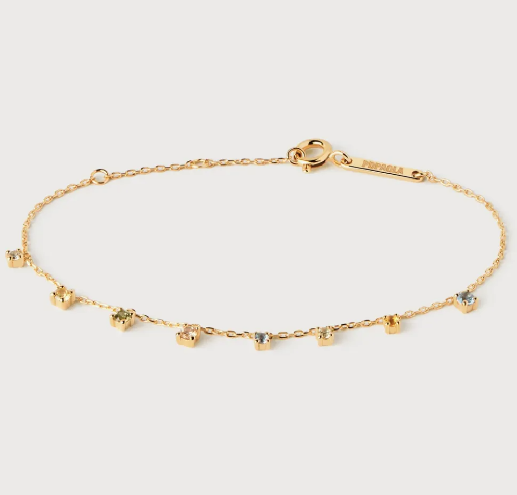 The Rainbow Salsa Bracelet by PD Paola features a gold-plated chain bracelet with eight multicolor zirconia stones. A unique bracelet or both a day or evening look. Packaged in a PD Paola luxury gift box.
