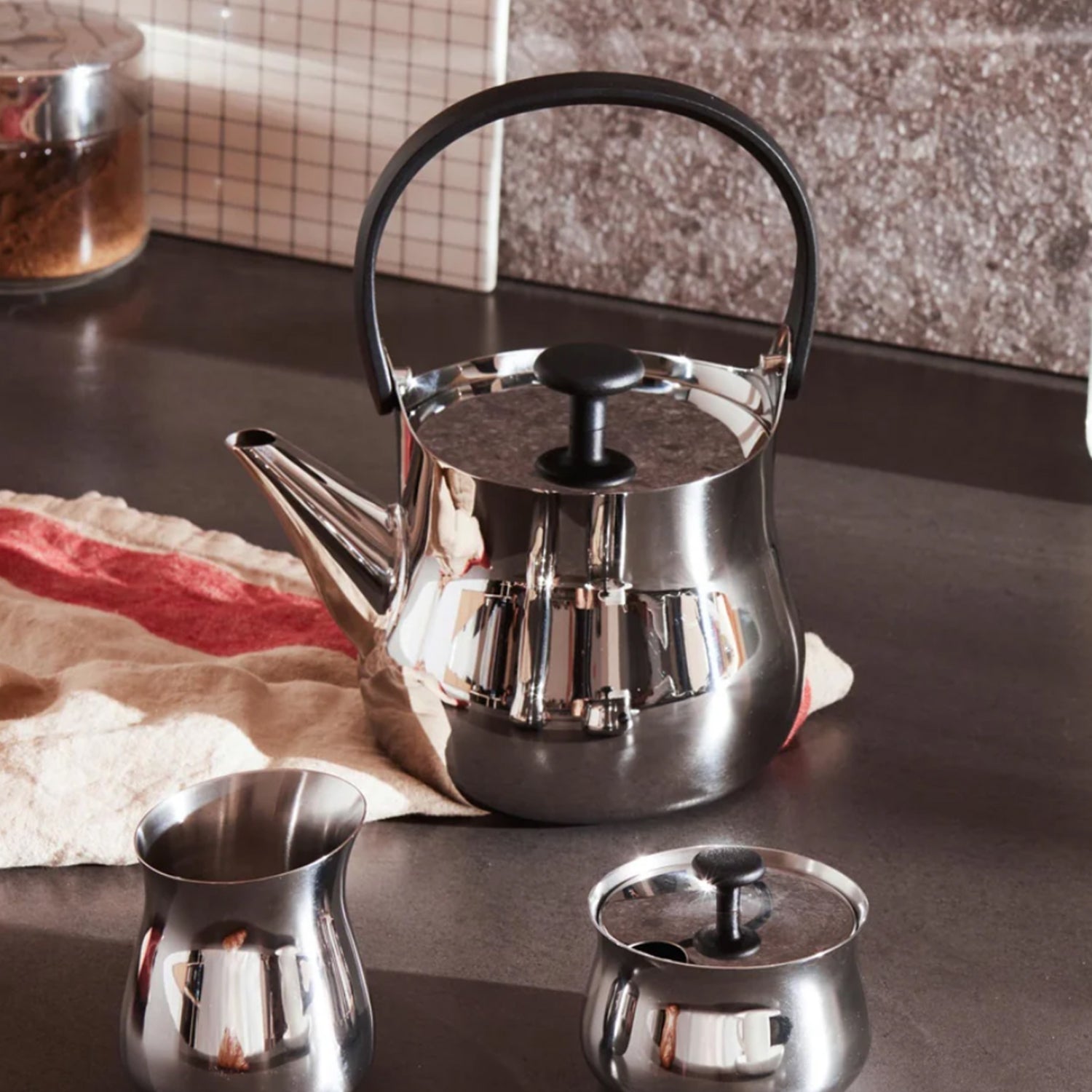 Dimensions: Cha’ kettle/teapot in 18/10 stainless steel (NF01) 22cm high. Two teacups and saucers.