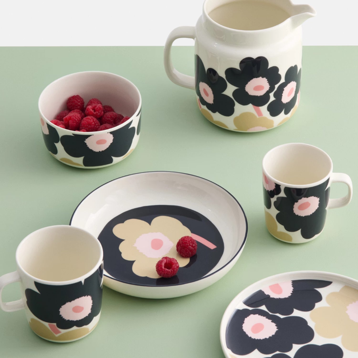 The Oiva Unikko Plate by Marimekko features the iconic poppy pattern in charcoal blue and pale pink. Unikko symbolising creativity, was born in a time when hardly any floral designs were included in Marimekko’s collections. Maija Isola, however, was fascinated by the theme of flowers and decided to create an entire range of novel floral prints.