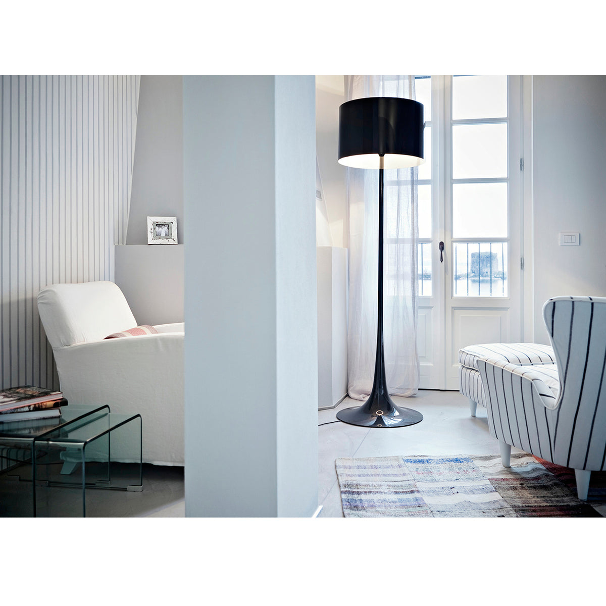 The Spun Floor Lamp designed by Sebastian Wrong for Flos is a contemporary take on a classic form. Employing the ultimate in manufacturing technology, its sleek metal frame and diffuser are crafted from die-cast aluminum resulting in a dynamic and fluid aesthetic. Spun combines a bold form with a sleek gloss black finish. An integrated dimmer within the cable allows for complete regulation of brightness. This contemporary floor lamp is perfect for modern living spaces or bedrooms.