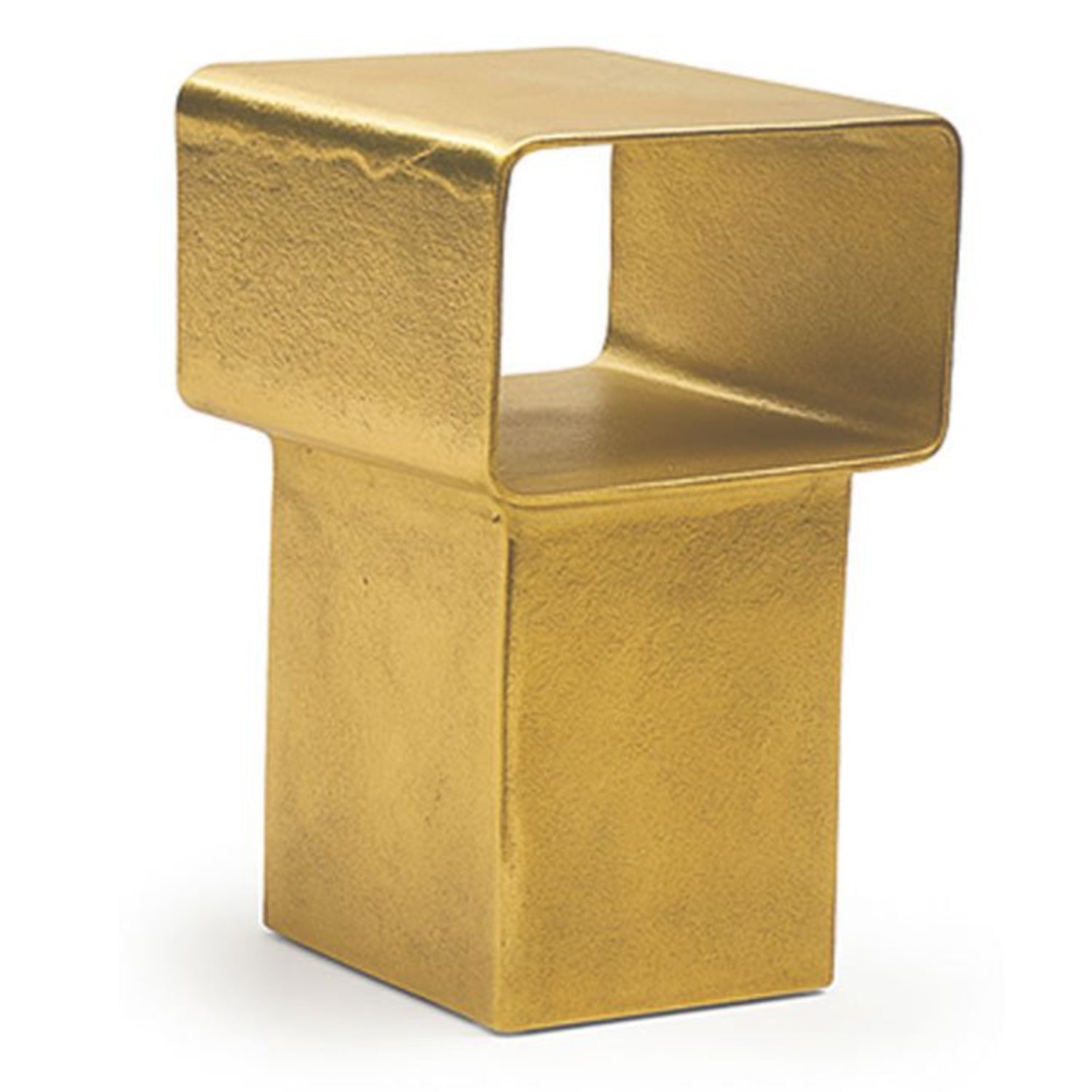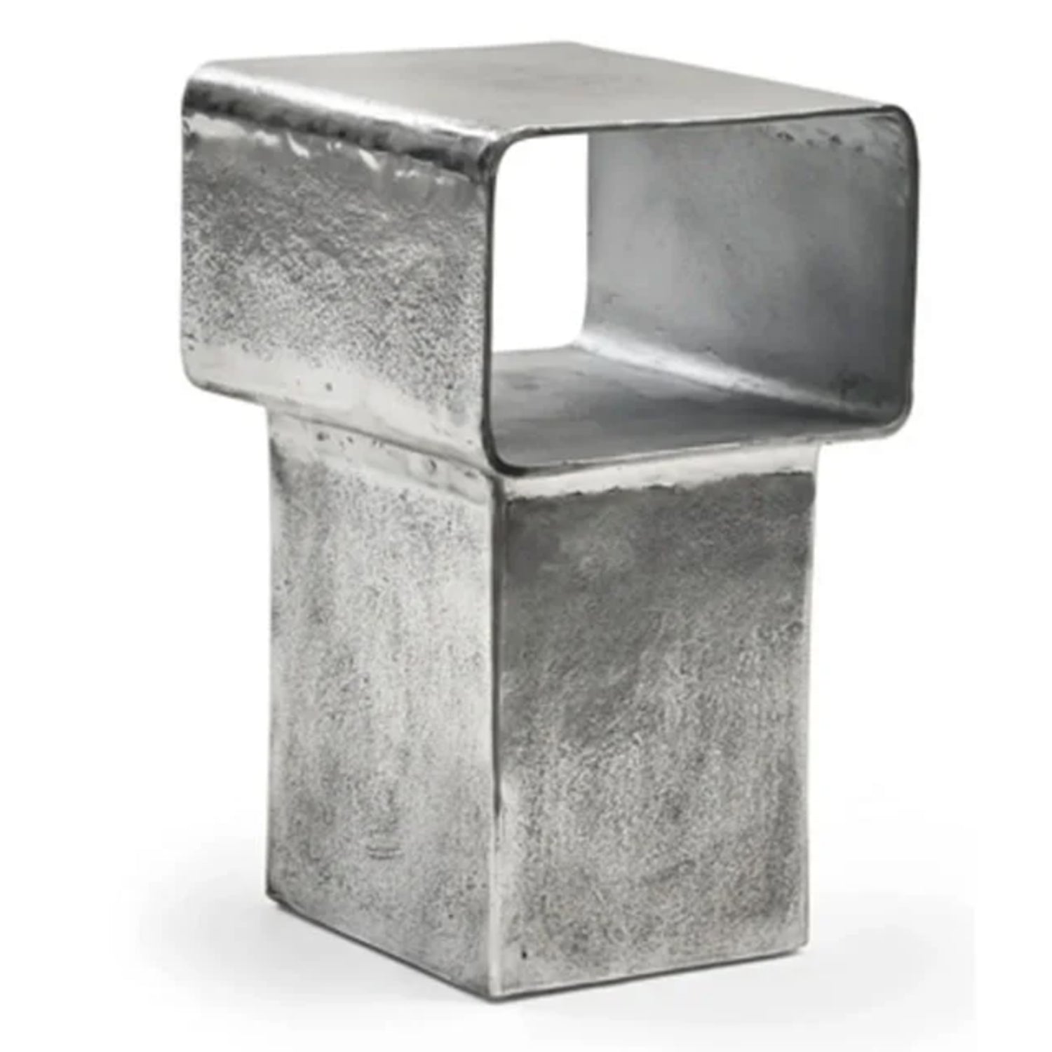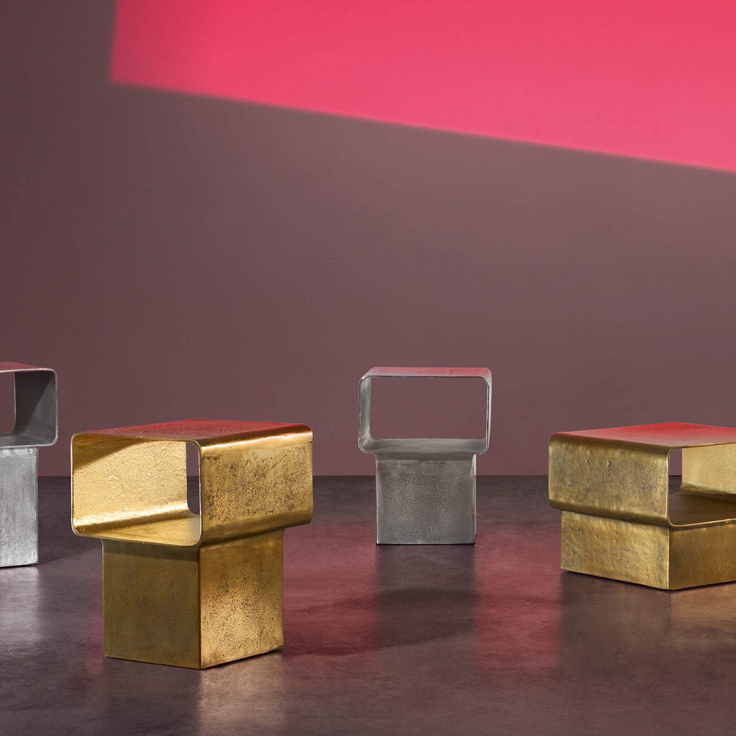 The Kira Side Table by designed by Marta Giardini for Gervasoni stands out for its bold, geometric form, referencing a modern sculpture with its totem silhouette in cast metal. Each table plays with volumes of solid shapes and voids, resulting in a side table which is both a functional design and a sculptural statement piece. Crafted from cast aluminum, with a cubic base and an open square top with rounded corners. The bronze or chrome finishes elevate this side table’s contemporary, industrial aesthetic.