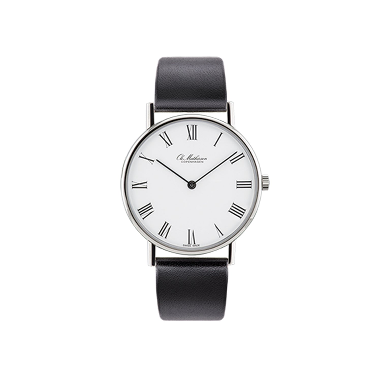 This design combines a white dial with roman numerals in black, completed by a scratch-proof convex sapphire crystal.  An elegant timepiece with a versatile and easy-to-wear black leather strap. The ultra-thin Swiss quartz movement is smooth and controlled for precise timekeeping.