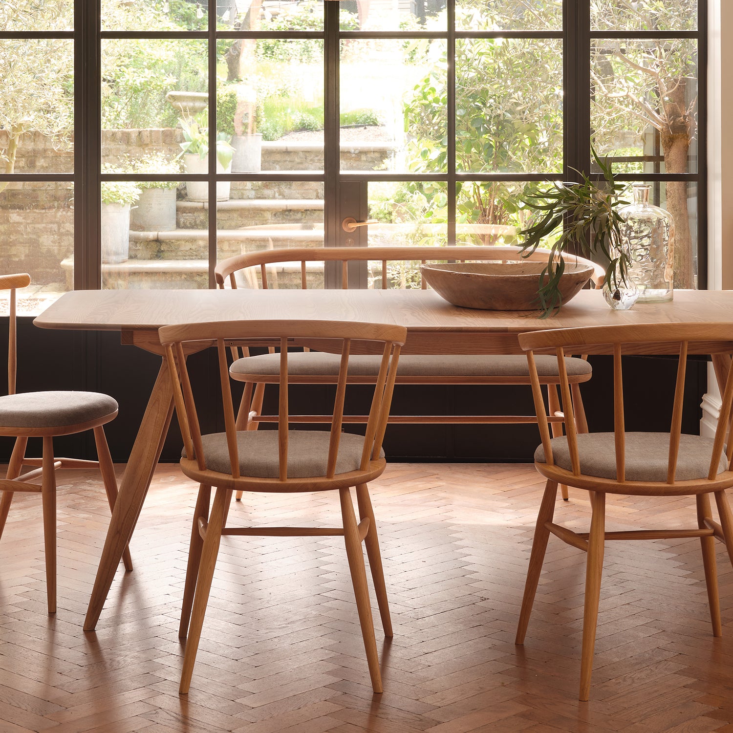 The Heritage Loveseat by Ercol, epitomises the mid-century modern style with its striking silhouette of curves in stream bent wood, tapered legs and back rest. Perfectly sized for two people, this compact dining bench is suited to dining areas, as a window seat or in a hallway. The upholstered seat increases the comfort factor for extended seating time. Crafted from solid oak, available in a black or natural finish, with a range of Ercol Universal fabrics.