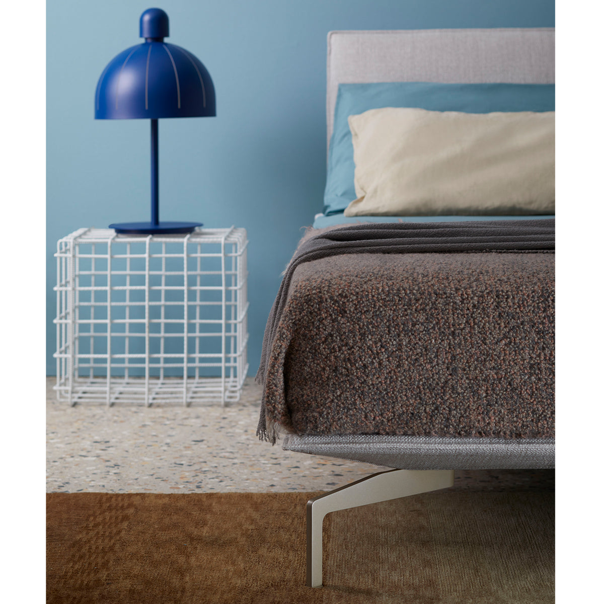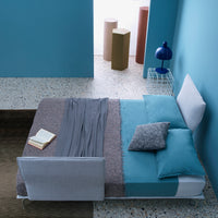 Materials: Metal base with painted metal feet. Orthopaedic bed base in semi-rigid multilayered wood with millings for mattress ventilation. Covered with velfodera coupled with pressed 300gr/sqm. Foam padding and fully removable upholstered covers. Headboard panels are in multilayered wood, padded with polyurethane foam and covered with velfodera coupled with polyurethane foam. The headboards are anchored to the base with metal plates equipped with brackets.