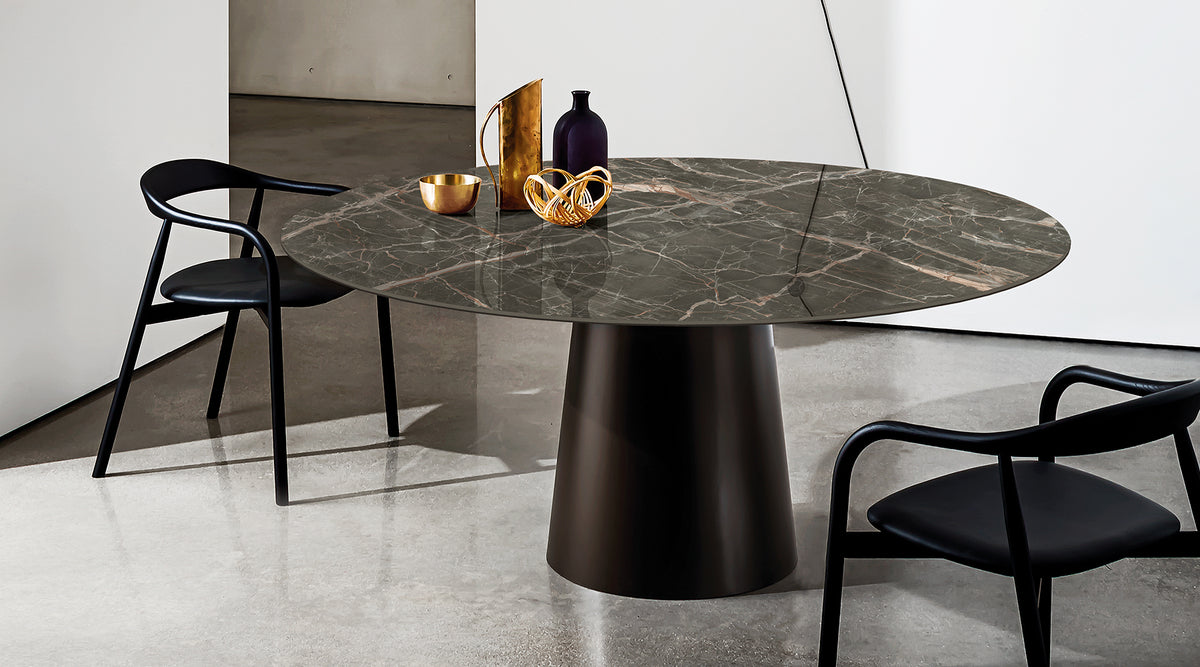 Treviso-based Sovet create modern furniture using traditional Italian glass-making techniques with an ultra-contemporary aesthetic. Explore the collection of dining tables combining with marble-effect ceramic tops, natural wood and streamlined glass. Contact our team to explore alternative sizes and finishes.