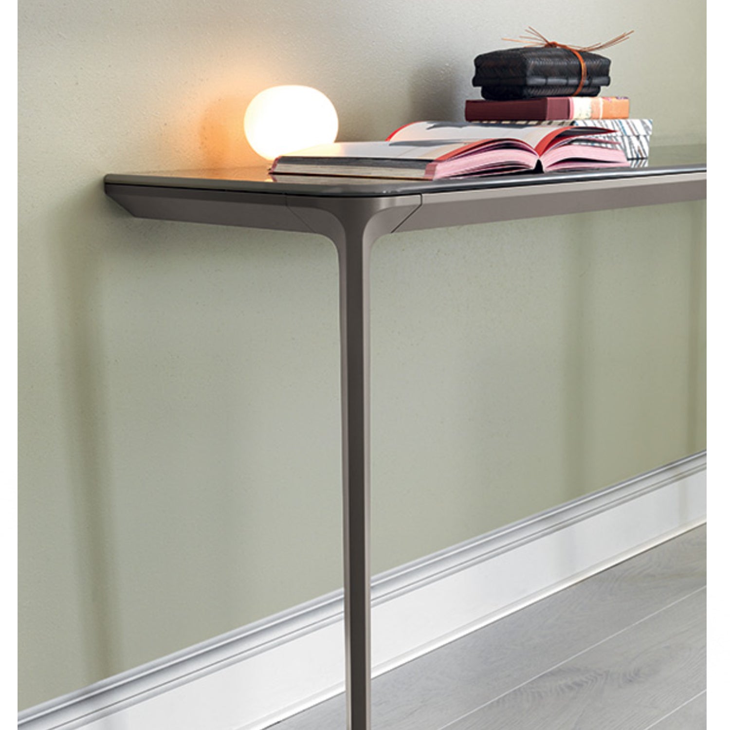 This contemporary console table is characterised by the luxurious, tactile nature of the table top and the minimal shape of the legs, making this the perfect solution for city living. The two-leg structure creates more floor space underneath the table with a visually lightweight aesthetic, whilst the table top is mounted to the wall with integrated fittings. Perfectly suited to hallways, entrances and dining spaces.