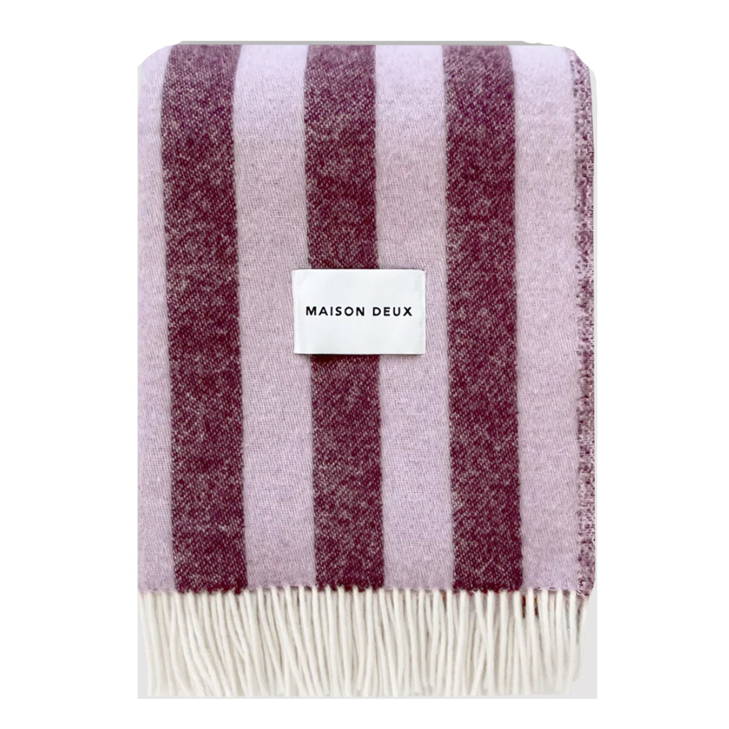 The Candy Wrap Stripe Blanket by Maison Deux is crafted from jacquard-woven 100% New Zealand wool in a pastel colour palette. Finished with fringe detailing at both ends, this luxuriously-soft premium wool throw is mirror-inverted on the opposite side. Perfect for hunkering down on the sofa or draped over the bed. This colourful blanket is sure to add the finishing touches to your interior. Machine washable at 30degrees.