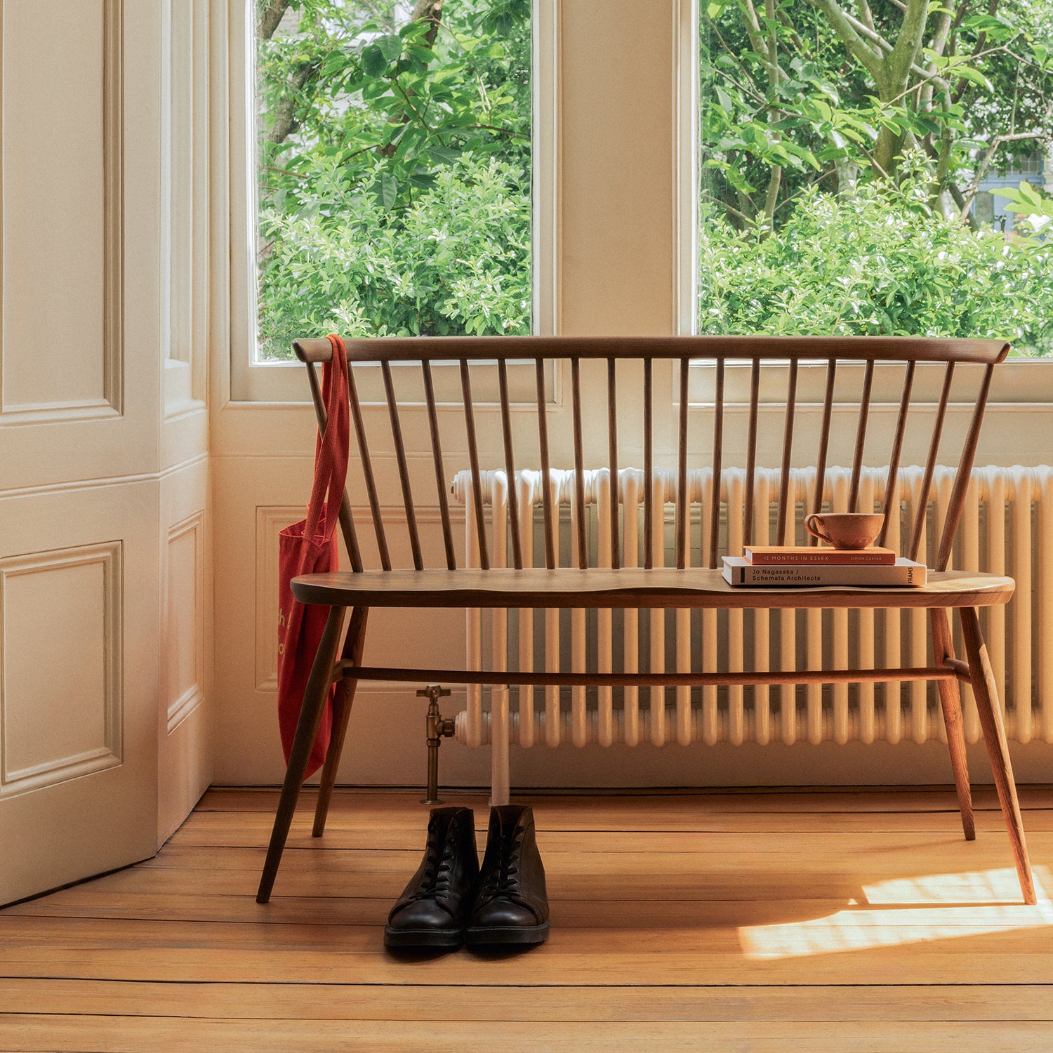 A progression of the iconic Windsor chair, the Love Seat designed by Ecol in 1956 features the unmistakeable silhouette, synonymous with the Mid-Century modern aesthetic. A steam-bent curved backrest, comprised of vertical spindles, is combined with tapered legs in solid ash or walnut. The outward shaped seat has ample space for two people and features a moulded base for optimum comfort.