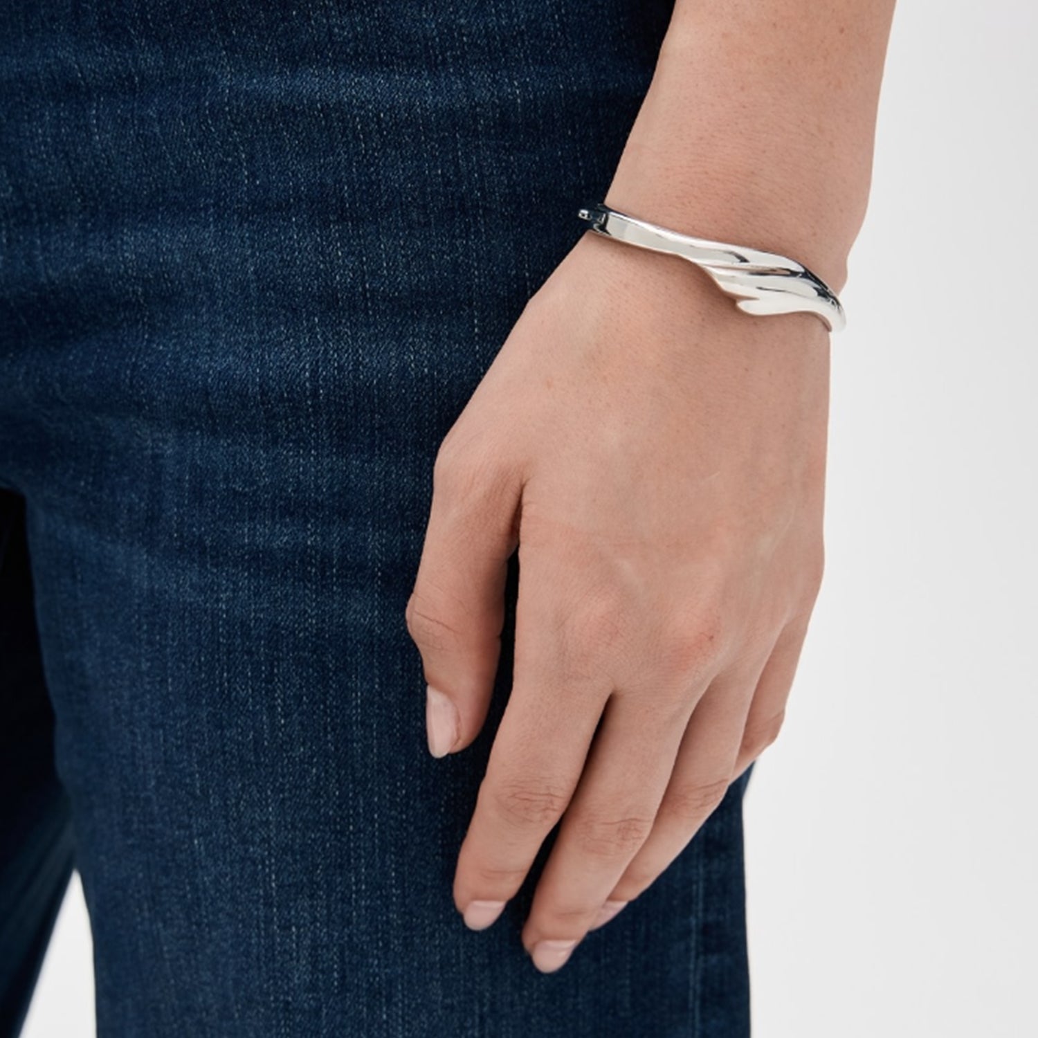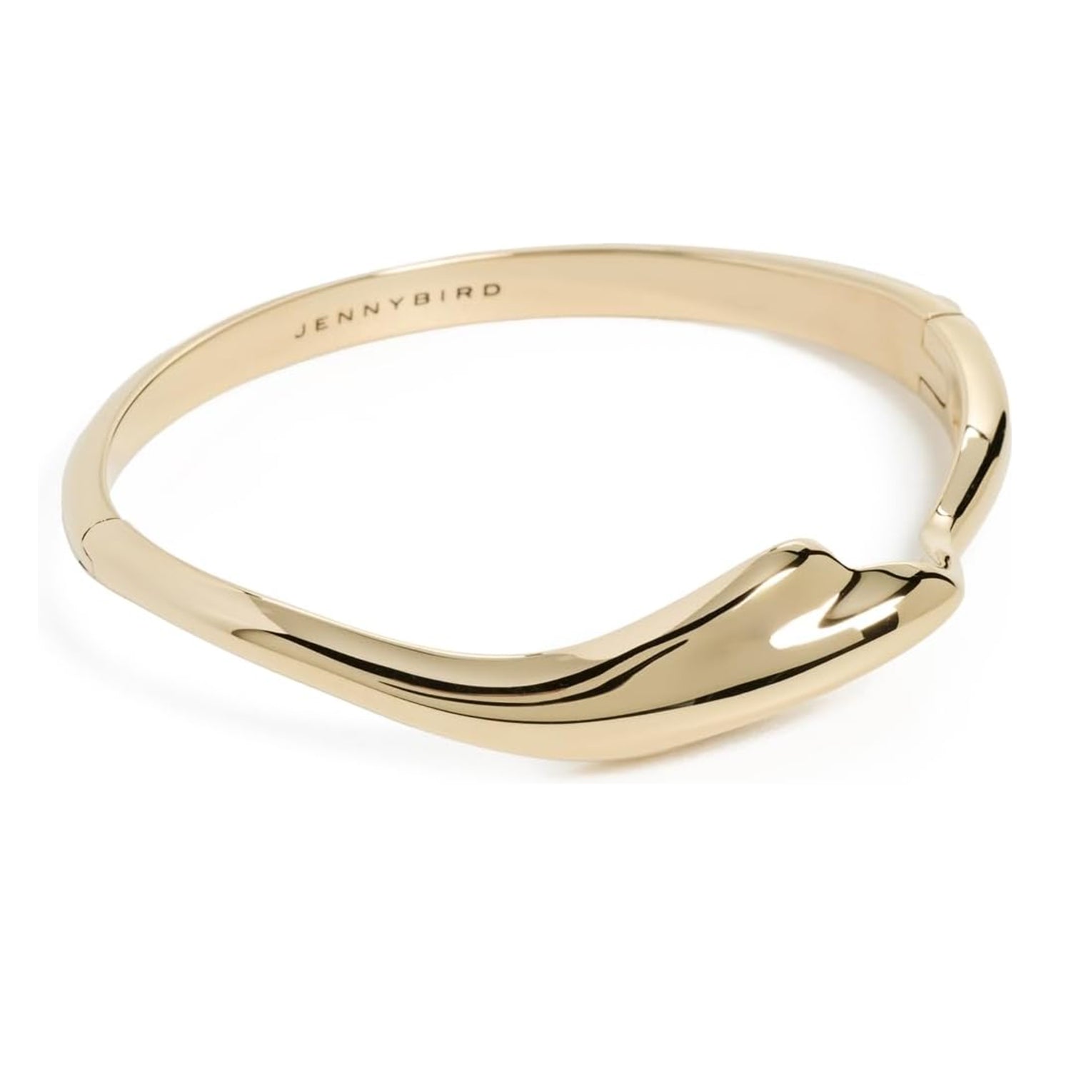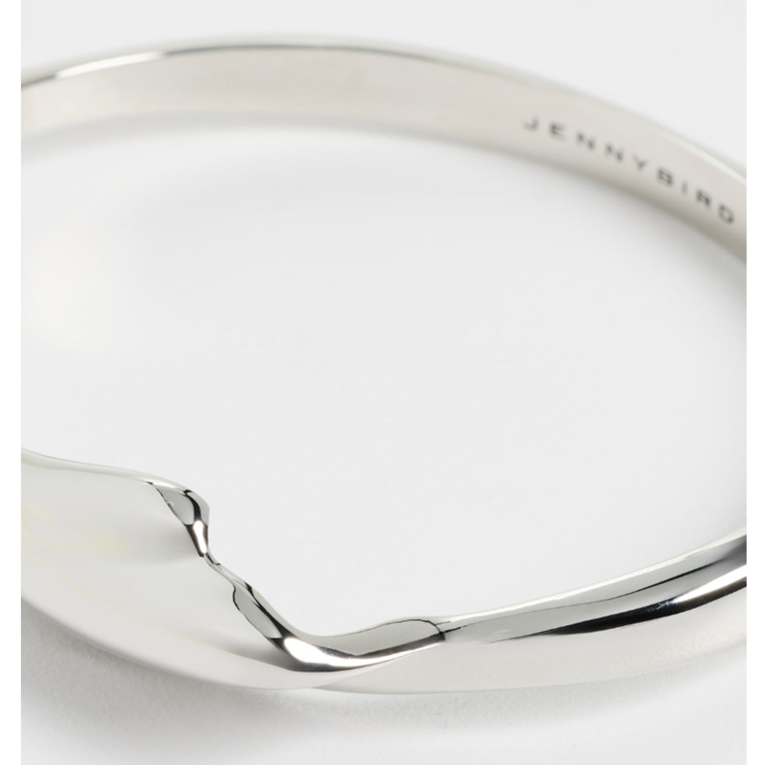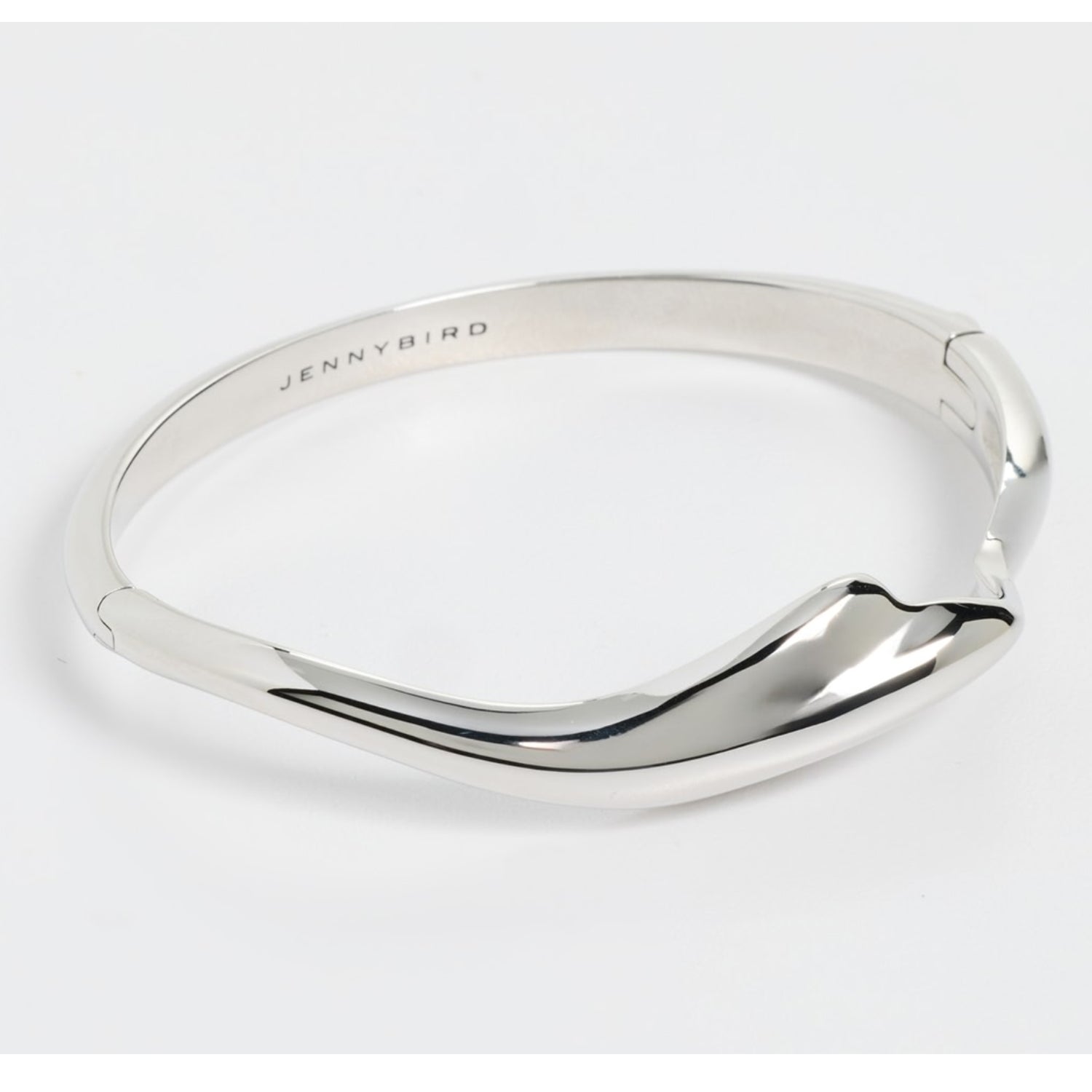 This elegant bangle by Jenny Bird is sure to add the finishing touches to your outfit both day and night. Featuring a minimal, sculpted design this modern bangle is beautifully crafted from steel with a high polish gold or rhodium finish. The push button clasp makes it easy to remove and replace. Packaged in a Jenny Bird gift box, this timeless bracelet makes the ultimate gift for your yourself or a loved one.